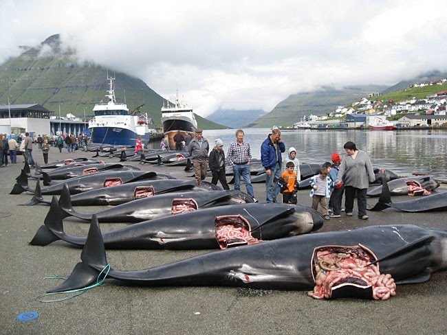 O massacre das baleias piloto em Faroes é similar ao massacre de golfinhos em Taiji no Japão, como mostrado do documentário The Cove. A diferença principal é que existe no mínimo 18 enseadas nas Ilhas Faroes, onde este massacre acontece, tornando extremamente difícil conseguir saber onde o massacre ocorrerá para se tentar impedir.